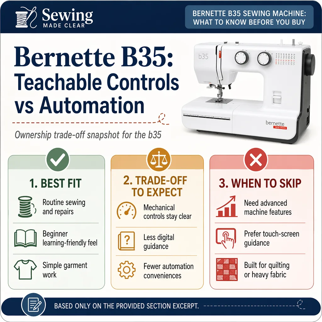 The bernette b35 sewing machine is a sensible buy for beginners and intermediate sewists who want a straightforward mechanical machine for repairs, hems, simple garments, and home projects. The answer changes if the main goal is computerized convenience, a broader feature stack, or heavier specialty work. If the sewing list stays practical and repeatable, the b35 keeps the setup simple instead of adding screen clutter.