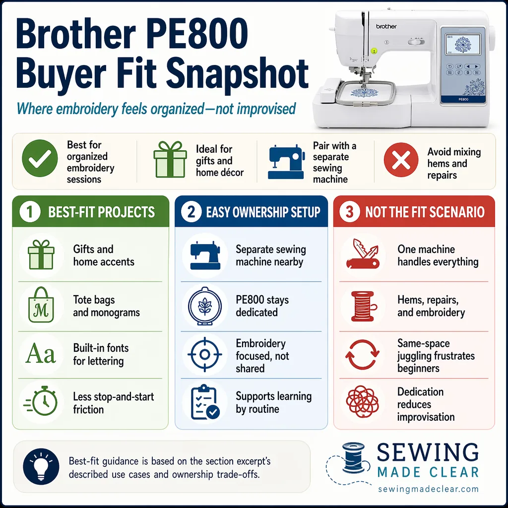 Best-fit scenario: a separate sewing machine sits nearby, and the PE800 stays dedicated to monograms, gifts, and home décor.