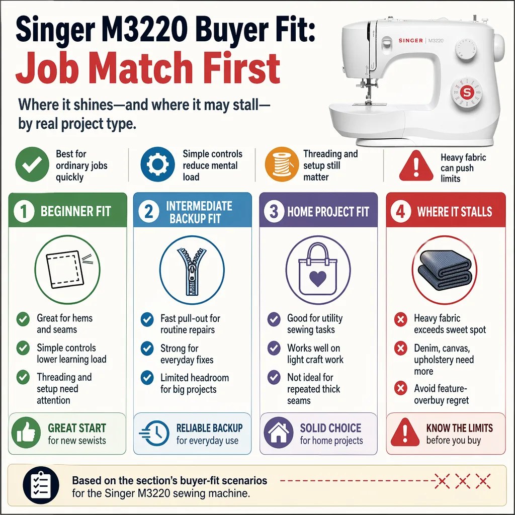 The M3220 fits buyers who want fewer choices and faster first stitches. A machine with more controls does not help when the actual job is a quick hem or a seam repair.